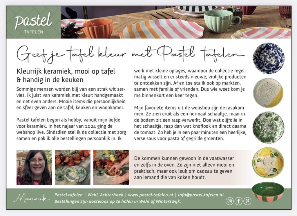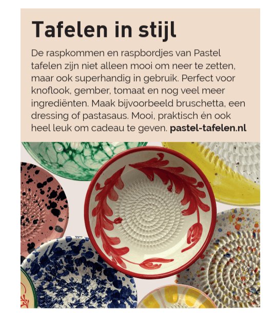 In maart 2026 verscheen Pastel Tafelen in Mijn Magazine. Daarin werd de webshop en het verhaal erachter uitgelicht: waarom ik ben begonnen en waarom vooral de kleurrijke raspkommen zo goed passen bij wat ik graag verkoop.