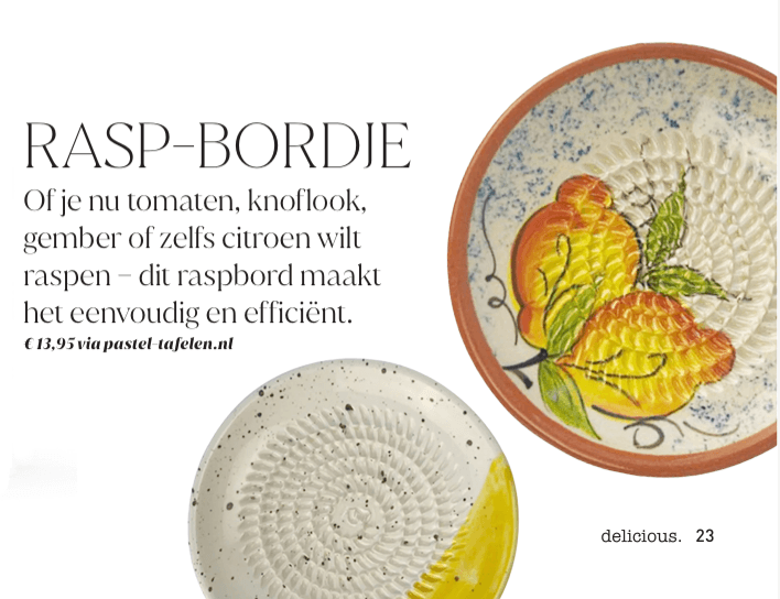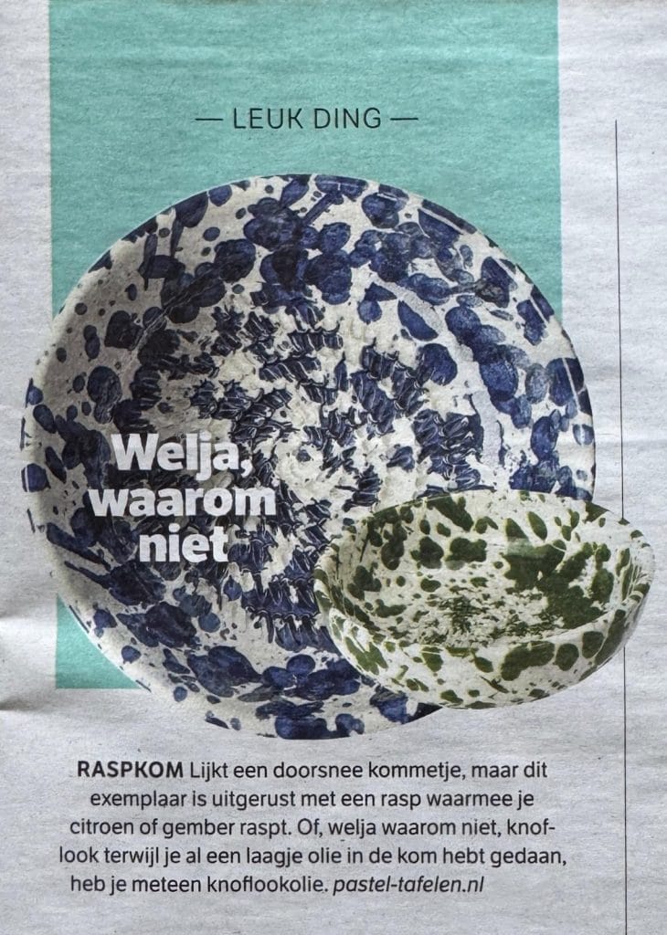 Op deze pagina vind je een overzicht van publicaties waarin Pastel tafelen is verschenen. Van food- en lifestylebladen tot woonmagazines en regionale uitgaven. Heel leuk om te zien dat de kleurrijke raspkommen en raspbordjes die ik verkoop hierin een plek hebben gekregen.