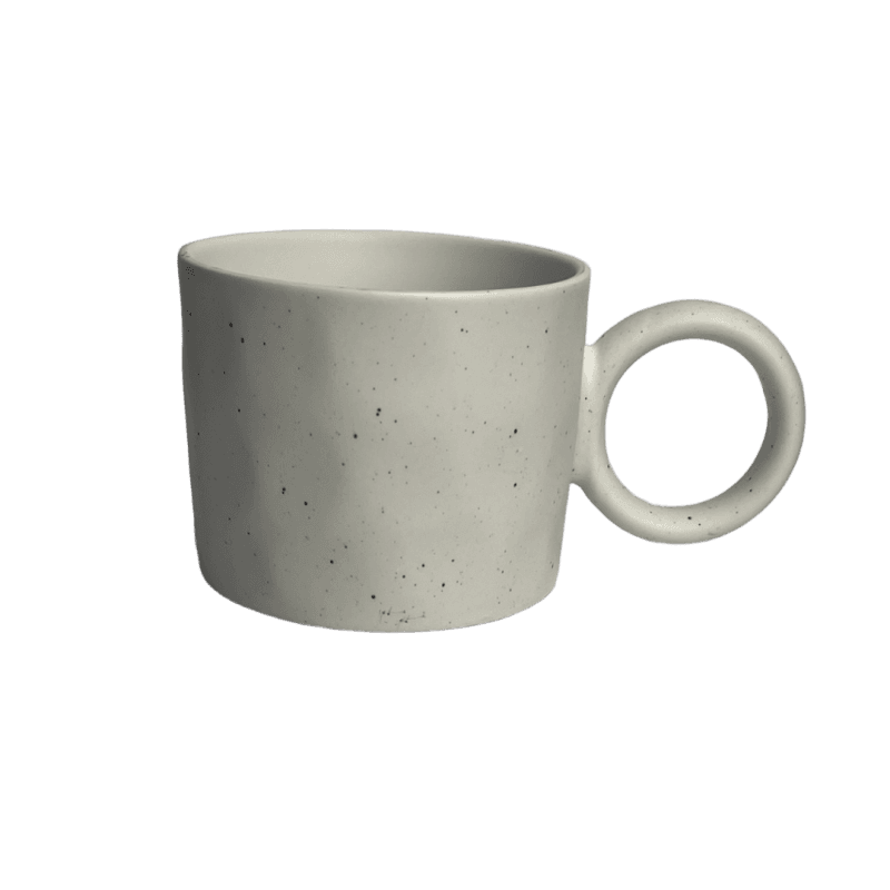 Eenvoudig, japandi stijl. Deze witte mok met zwarte spikkels en ronde oor ligt prettig in de hand en past in elk servies. Perfect voor koffie, thee of warme chocolademelk.