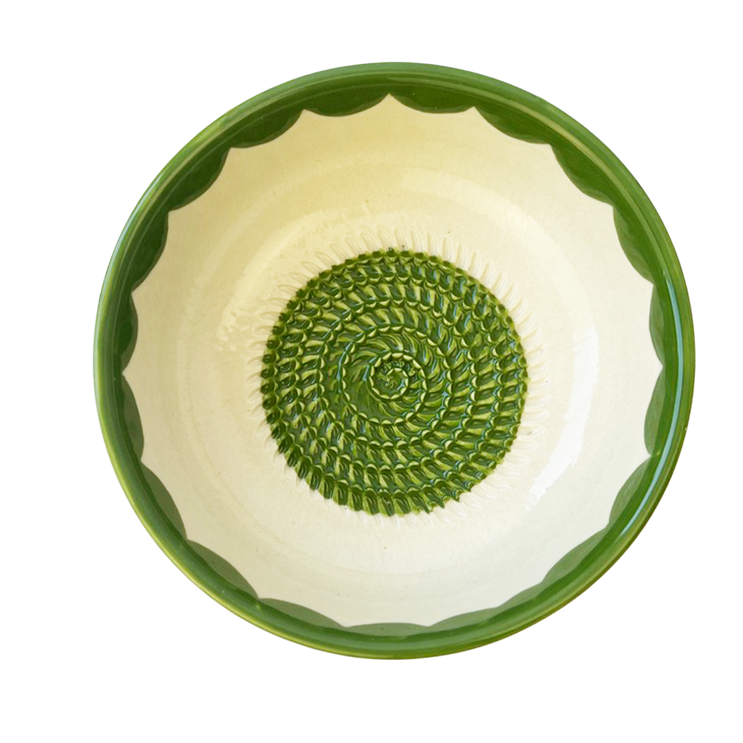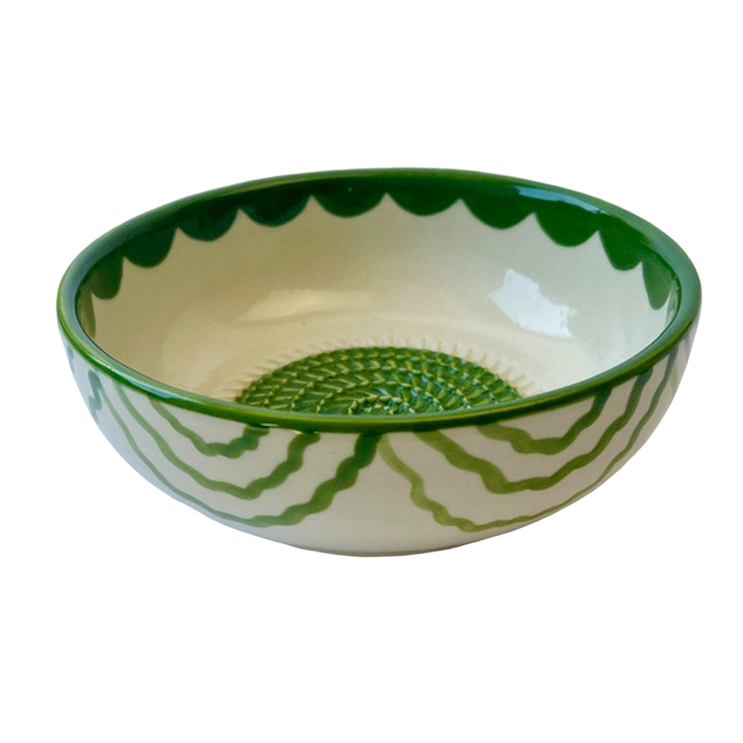 Deze raspkom is met de hand vervaardigd en voorzien van een groen, met de hand geschilderd patroon. De binnenzijde bevat fijne ribbels waarmee je eenvoudig knoflook, gember of citroen kunt raspen – perfect voor dressings, marinades en smaakvolle gerechten.