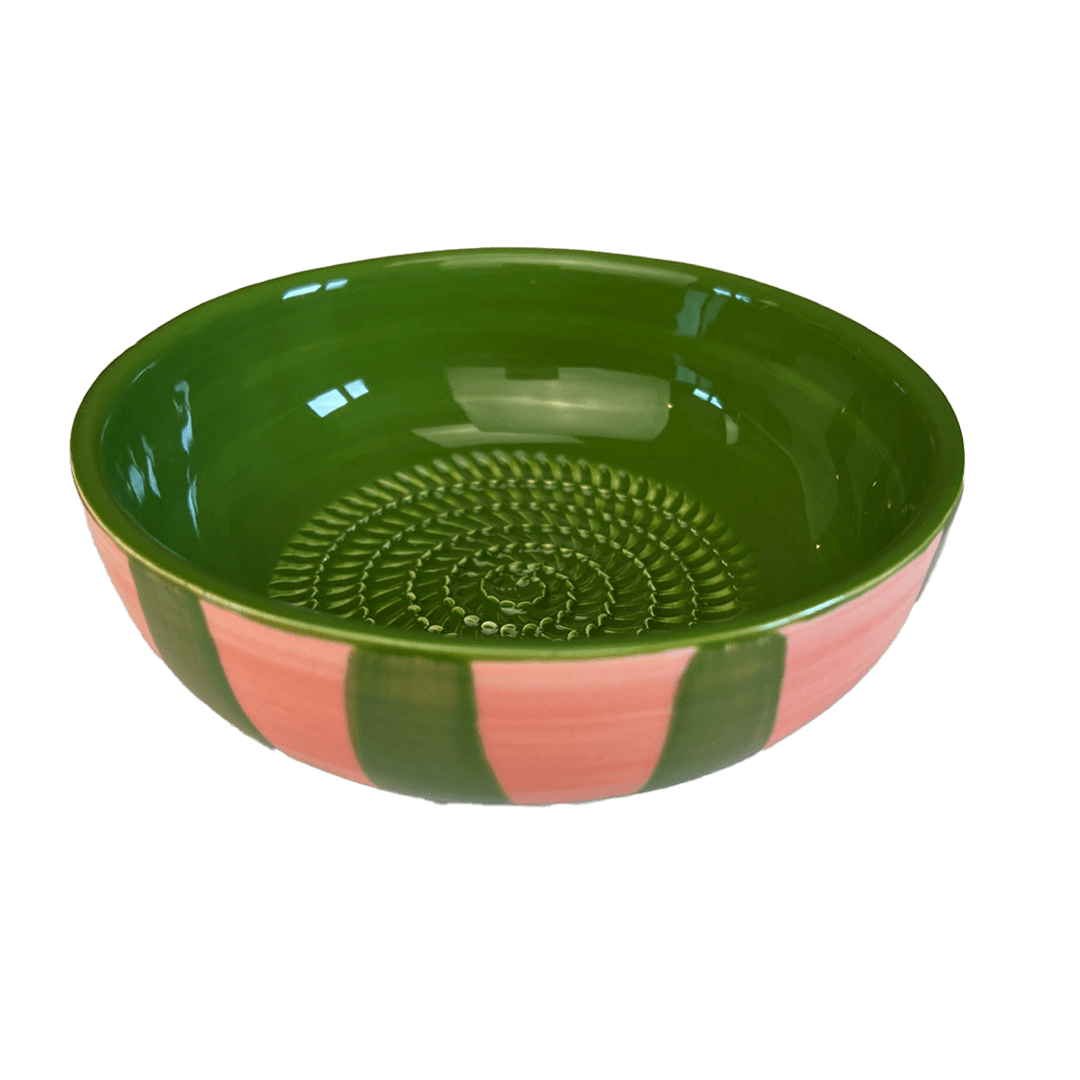 Deze raspkom is met de hand gemaak, in de kleuren roze en groen. De binnenzijde bevat fijne ribbels waarmee je eenvoudig knoflook, gember of citroen kunt raspen – perfect voor dressings, marinades en smaakvolle gerechten.